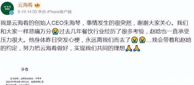 不知道您对此有什么看法呢?欢迎在下方评论区留下你的想法,喜欢文章记得点赞关注我们下期再见。 [免责声明]文章的时间、过程、图片均来自于网络,文章旨在传播正能量,均无低俗等不良引导,请观众勿对号入座,并上升到人身攻击等方面。观众理性看待本事件,切勿留下主观臆断的恶意评论,互联网不是法外之地。本文如若真实性存在争议、事件版权或图片侵权问题,请及时联系作者,我们将予以删除。 信息来源: 百度百科:敖其尔、赵晗、陈光前、罗几个人资料 云海肴创始人赵晗遗体告别仪式举行亲属:他身上有一种“燃”的力量.红星新闻-百家号 云海肴回应40岁创始人赵晗去世,现任CEO朱海琴:会带着和他的约定,实现共同理想.九派新闻 55岁资深男星倒毙家中多日友人报警揭发,五年前“跳桥轻生”捡回一命|星岛环球网.星岛环球网 资深男演员被发现在家中去世多日,唯有狗狗守候在旁,令无数网友唏嘘.新民晚报