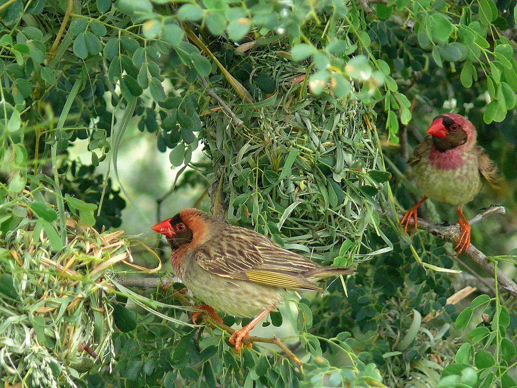 在繁殖的季节,雄性红嘴奎利亚雀会早早地把窝搭建好,这些鸟窝要么搭建在树上,要么搭建在草地上。
