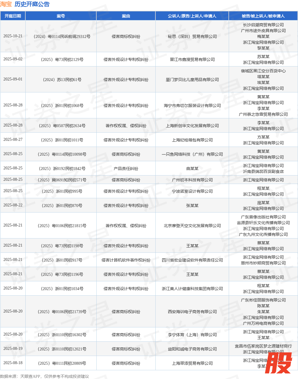案号:(2025)浙0782民初20216号审理法院:义乌市人民法院案由:侵害作品复制权、发行权、信息网络传播权纠纷当事人信息: 原告/上诉人:林某某 被告/被上诉人:义乌市芸宁家居用品有限公司、浙江淘宝网络有限公司开庭日期:2025年6月20日根据统计,近一年内以浙江淘宝网络有限公司为当事人的历史开庭公告有7930则,其中案由为“侵害商标权纠纷”的公告以3471则居首,其次为“网络服务合同纠纷”有1024则,“著作权权属、侵权纠纷”有600则。历史开庭公告(前20条)如下: